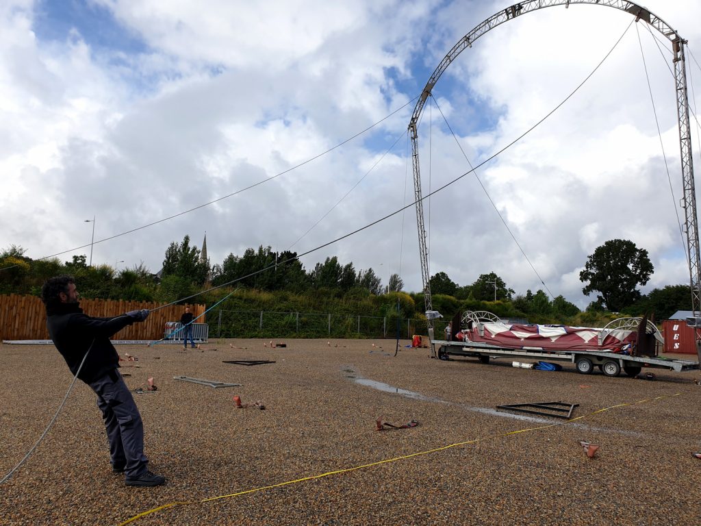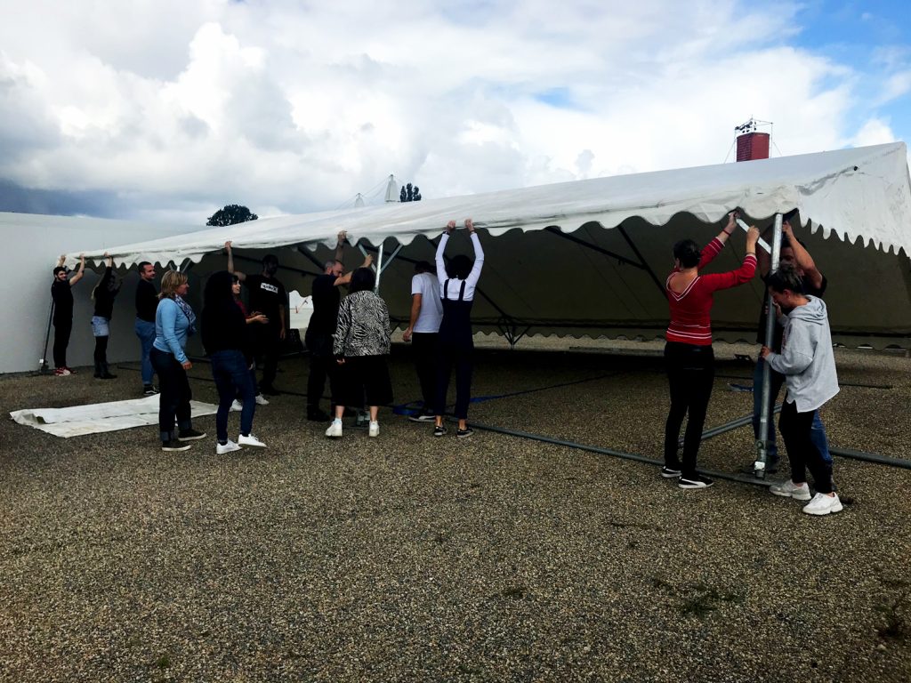 Pour la création participative de la compagnie Yvann Alexandre, 39 participant.e.s se retrouvent devant le chapiteau spectacle pour un échauffement particulier autour de la création de lien et de la reconnexion entre eux. Les équipes ont envie d’en faire partie en observant cette scène poétique.