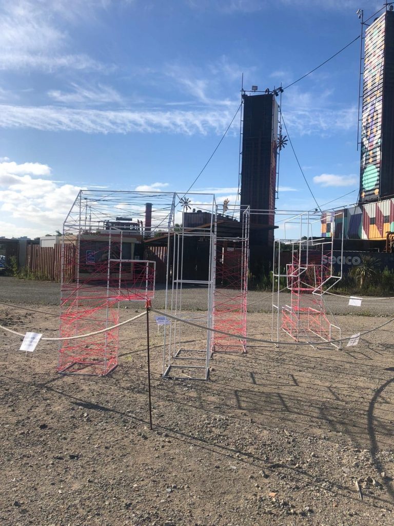 Des nouveaux éléments arrivent sur site : des blocs béton formés en îlots de différentes nature/dimension qui vont devenir un mur d’expression libre et une structure en métal “FAIRE” qui va être composée de fils pour tisser du lien. Merci studio Katra !