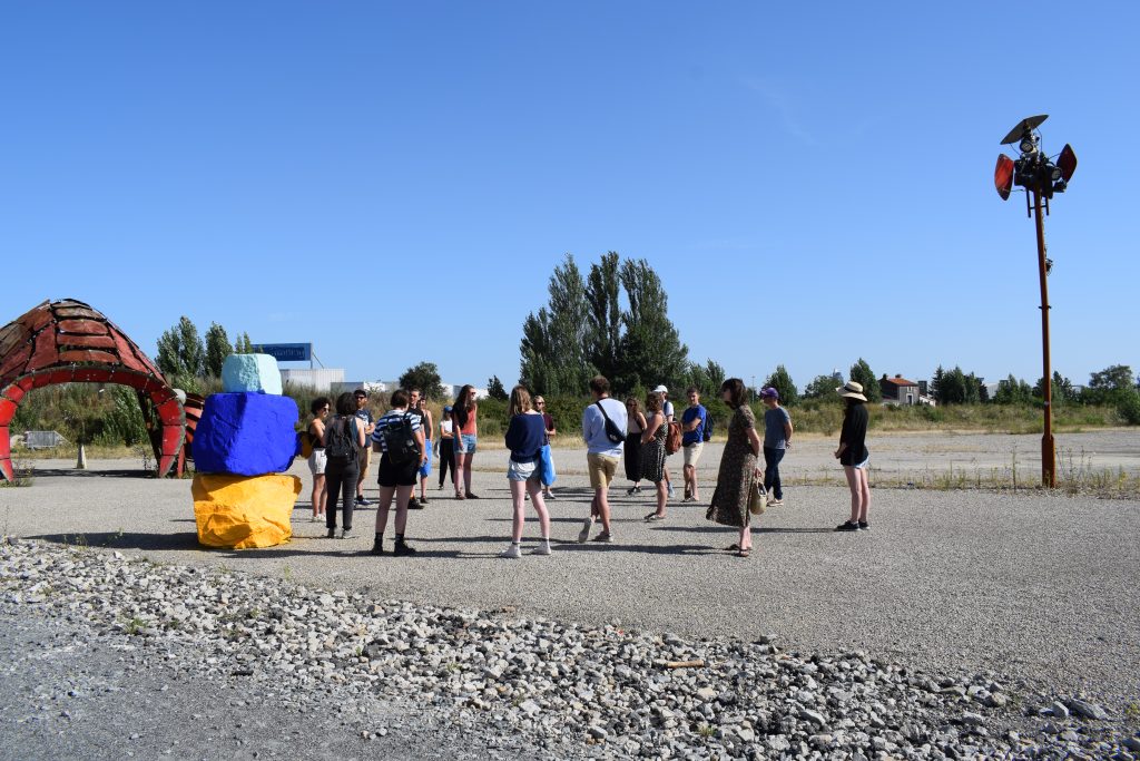 En début d’après-midi, les artistes accueillent le groupe de non et malvoyant.e.s pour un atelier autour de l’écoute sur le site de Transfert. Accompagné d’une géographe sonore, le groupe fait un tour du site pour une écoute flottante, écouter les sons présents autour d’eux. Il est conclu rapidement qu’il est rare d’entendre autant de bruits différents à un même endroit en si peu de temps : des choses fines, des choses lointaines ou d’autres très proches. Grâce aux sons, il est également possible de fabriquer un paysage mental.