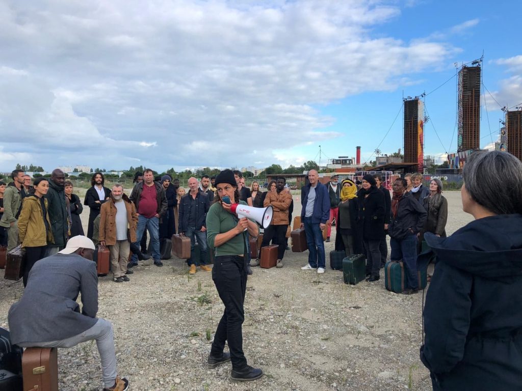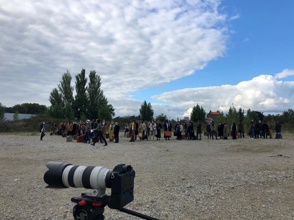 17h, le tournage commence sur le site avec les figurant.e.s : une trentaine d’inconnus et de visages familiers se déploient sur le site, vêtus d’une déclinaison de kaki, gris et beige, chapeaux et valises sous le bras.