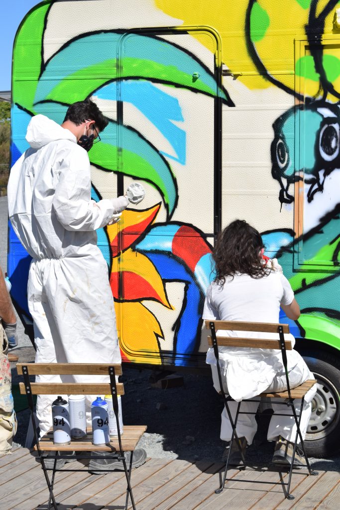 L’espace bibliothèque prend forme ! L’équipe de jeunes bricoleur·euse·s de Motiv’Action et le graffeur Arthur Ratur ont personnalisé la caravane, sous un soleil de plomb. Résultat à découvrir dès ce week-end sur Transfert !
