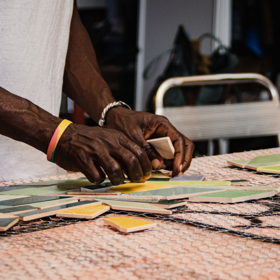 Chaque participant choisit sa mission. Cet atelier a pour but de réorganiser des pièces de carrelage pour créer une mosaïque collective. Cette dynamique est un exercice de « rompre et construire » qui invite le participant à jouer et à se défouler en cassant les pièces, puis à réaliser une activité manuelle et constructive.