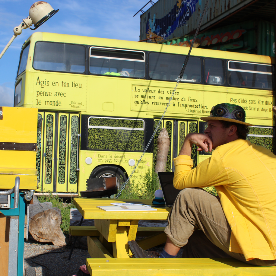 Cet été et comme les années précédentes, le Laboratoire de recherche-action de Transfert établit ses bureaux sur le site de Transfert. Deux grandes tables jaunes sont installées devant le bus -lui aussi jaune décidément- sur lequel sont inscrites plusieurs citations inspirantes de personnalités emblématiques de l’histoire de France, de l’urbanisme ou de la pop culture.