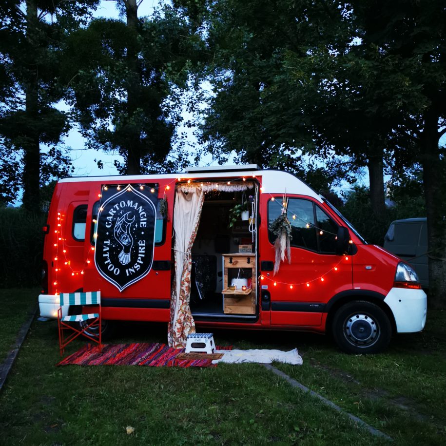 Après avoir ouvert un salon de tatouage dans sa ville d’origine, « Bon Voyage » (qui compte aujourd’hui @coraline.astier et @cheval.tattooer), Émilie parcourt les régions, et participe à des festivals comme La Rive aux Barges (44/35), Festibière (63). Et a eu l’occasion de poser son camion lors d’événements plus petits comme à Beuzec-Cap-Sizun (29), à La Plagne (73). Ou tout simplement tatouer des clients en pleine nature en Auvergne, à côté de Grenoble, à La Roche-Bernard…